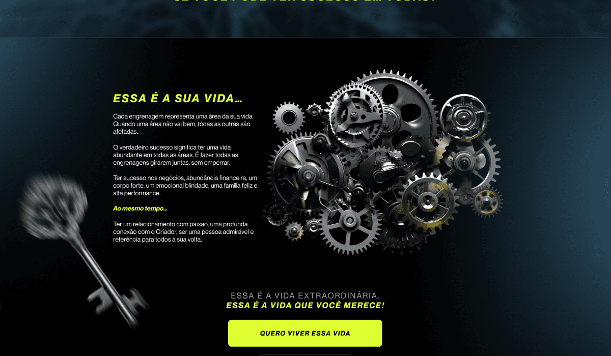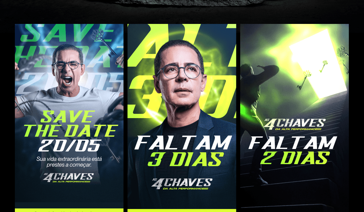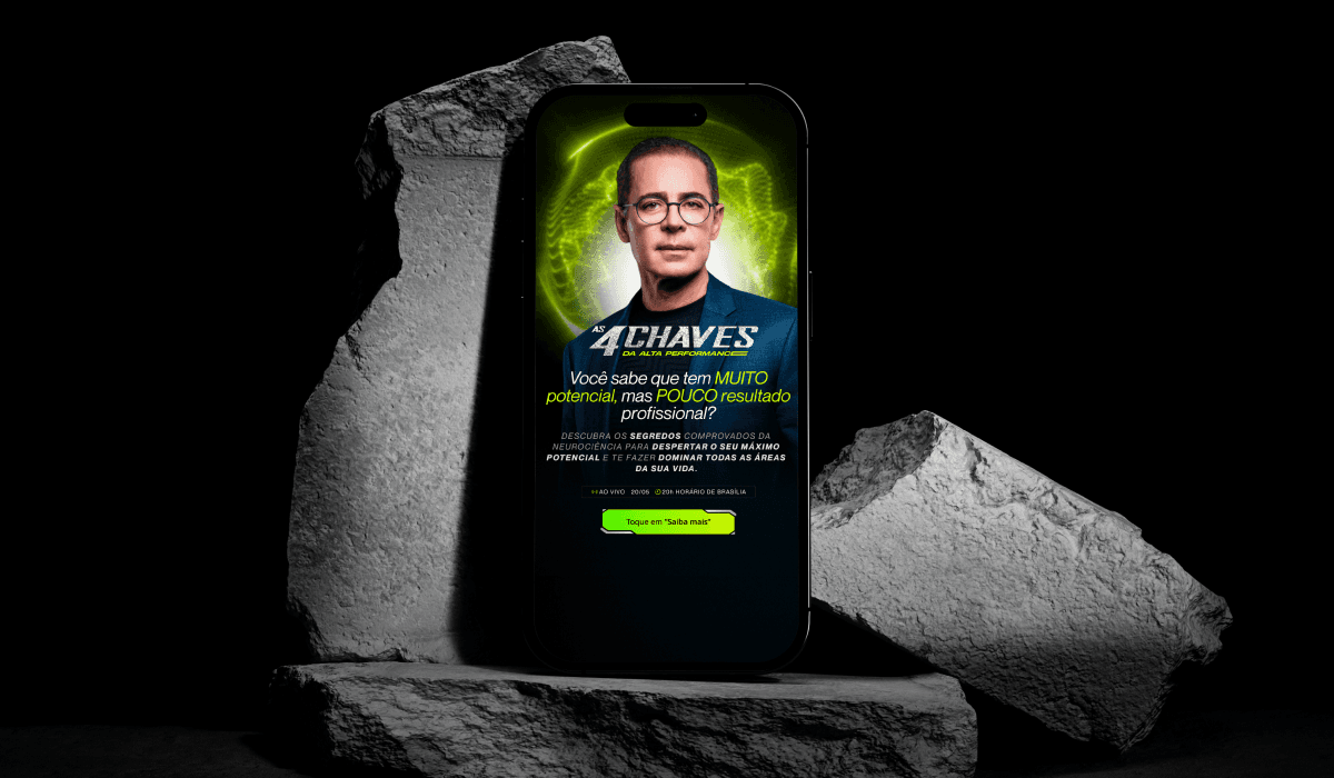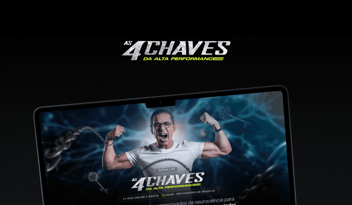 A Super Live "As 4 Chaves da Alta Performance" é um evento de imersão que apresenta estratégias comprovadas para potencializar resultados em diversas áreas da vida. Nosso desafio foi desenvolver uma identidade visual impactante, criar materiais criativos envolventes e uma página de captura persuasiva para maximizar a conversão de inscritos.