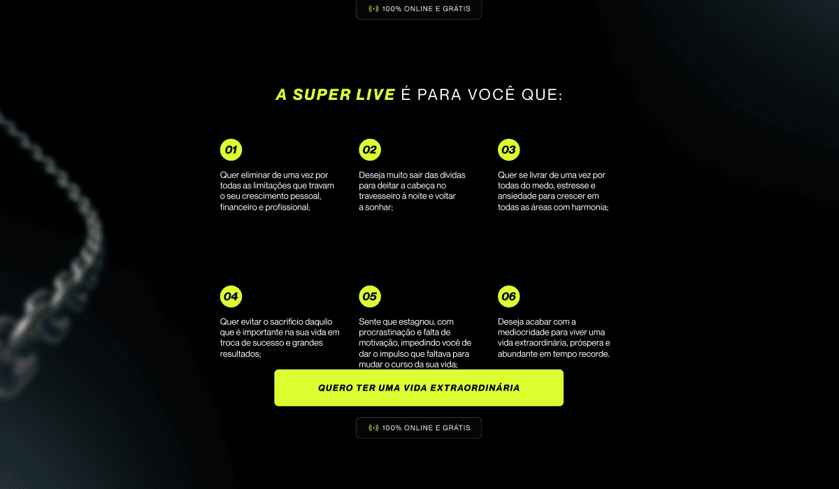 Página de Captura Estratégica: Estruturada para facilitar a tomada de decisão do visitante, destacando os principais benefícios da live e estimulando a conversão.