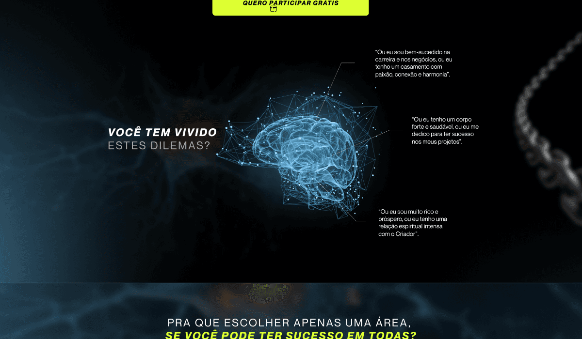 Era essencial criar uma identidade visual forte e coesa, capaz de diferenciar o evento no mercado. Além disso, a página de captura precisava ter uma estrutura persuasiva para converter visitantes em inscritos de forma eficaz, enquanto os criativos deviam gerar conexão emocional e despertar curiosidade no público-alvo.