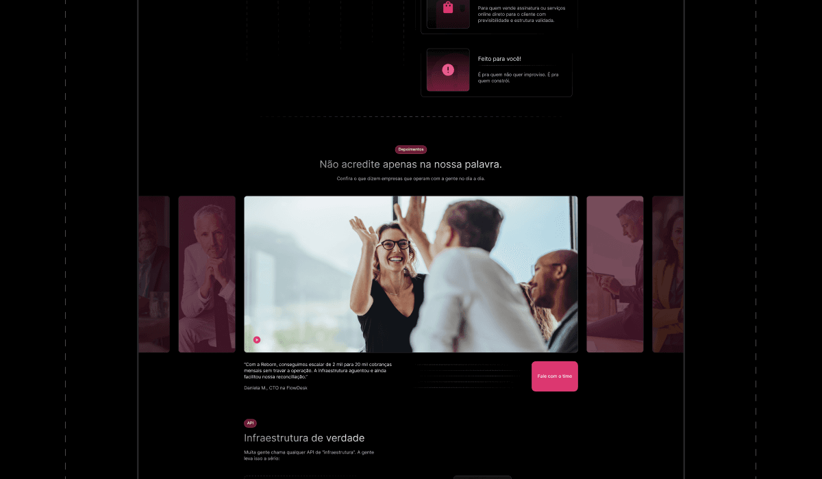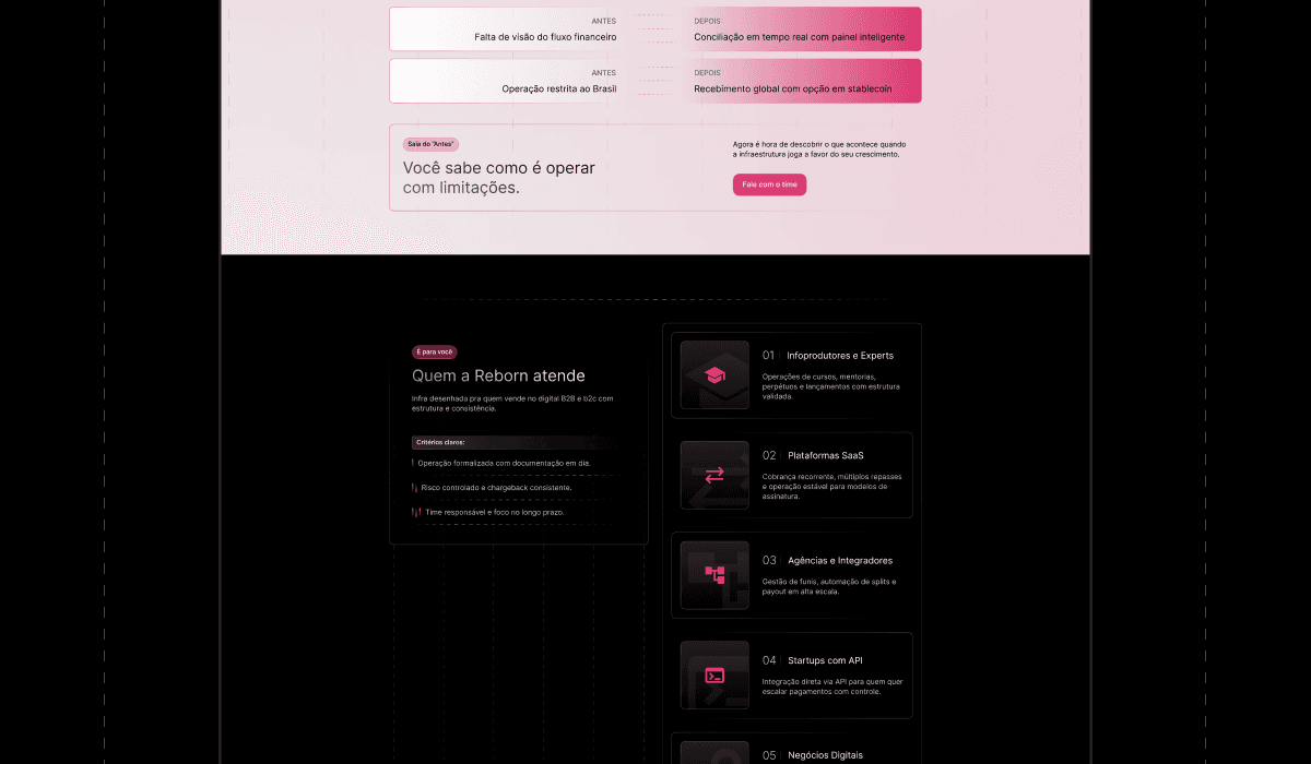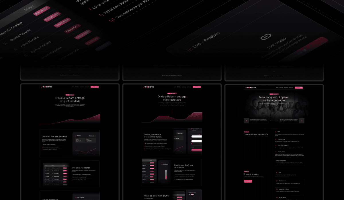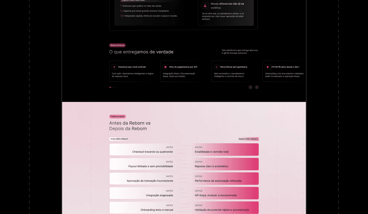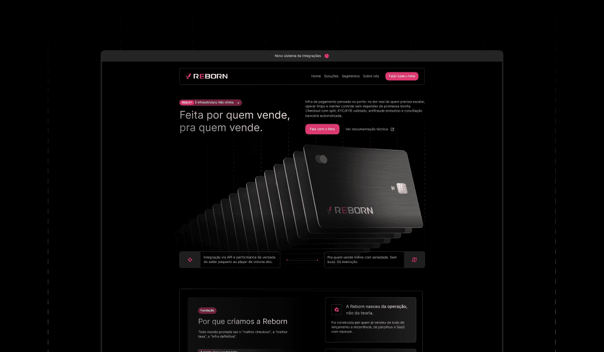 O resultado é uma Home que posiciona a Reborn como uma ferramenta indispensável para quem busca vender com consistência, além de servir como base para futuras páginas internas e expansões do produto.